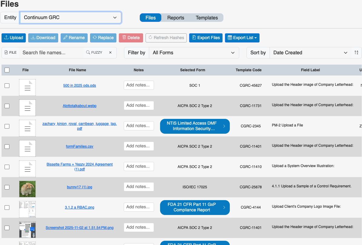 The audit and evaluation process depends on documentation and evidence to show that an organization has achieved compliance with a control. In ITAM, much of that evidence consists of files uploaded into the appropriate fields in a form. These files may be images, text, affidavits, spreadsheets, or almost any other type of file that conveys the information needed. The File Manager is a convenient way to view the files uploaded by an entity and interact with them.