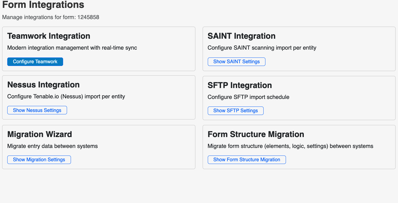 Several third-party providers have created integrations for the IT Audit Machine forms. These integrations are specific to each platform, and new integrations are added periodically.
