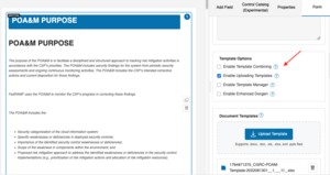 Scroll down through the additional options presented until you find the Template Options. Make sure only the Enable Uploading Templates option is selected. Upload the POA&M template you will use to generate the POA&Ms from the system by clicking Upload Files and selecting the template file from your system.