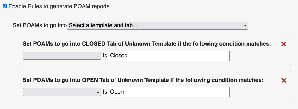 This will bring up the Form Logic interface for the POA&M form. Find the option to enable Rules to generate POAM reports and check the box next to the text. This will bring up the ability to select where the POA&Ms will go. Set entries where the POA&M Current Status field is Open to go into the OPEN tab, and the entries where it is Closed to go into the CLOSED tab.