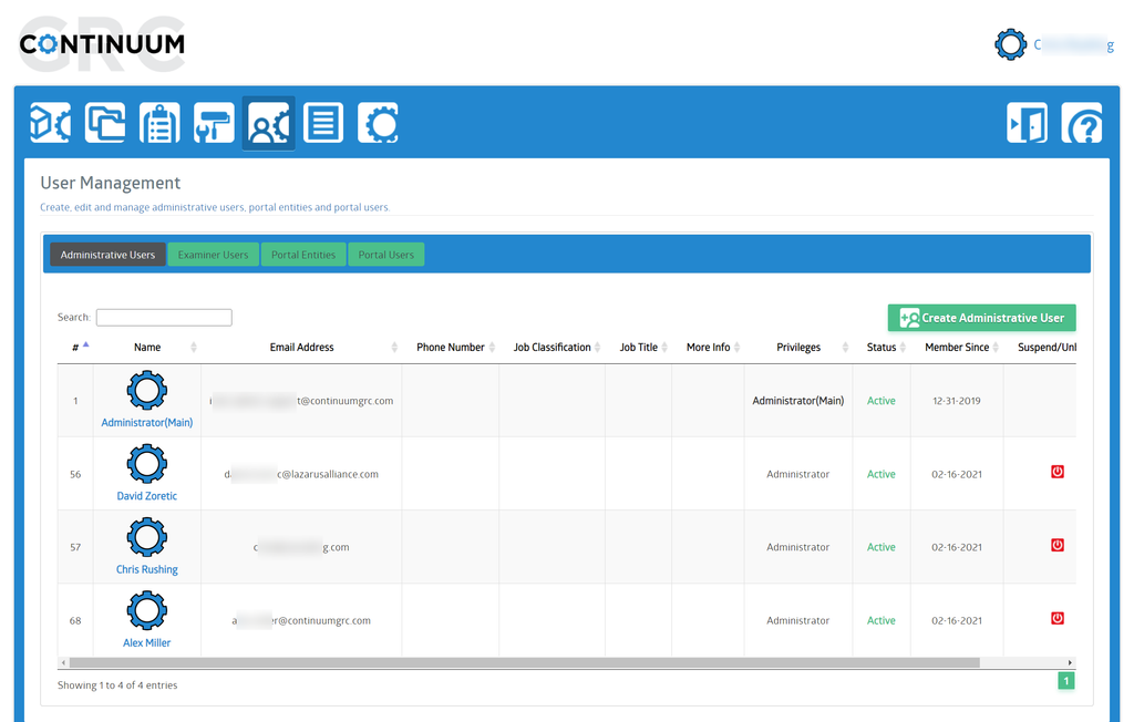 Examiner Users fill a gap between Portal Users and full Administrative Users. They are similar to Portal Users except that they can review the work done by other Portal Users in their entity. They can also update dashboards, but they lack the full administrative capabilities of the Administrative Users.