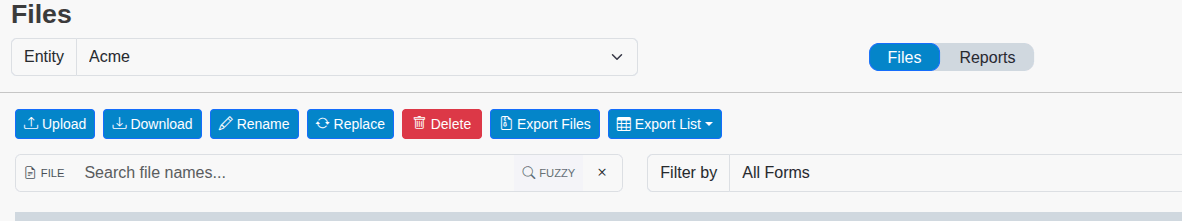 When the File Manager is first accessed, it typically does not display any file data until an Entity is selected from the Select an Entity dropdown at the top right of the working area. To select an Entity, click on the dropdown, choose the entity whose files you wish to review, and then click the Go button.