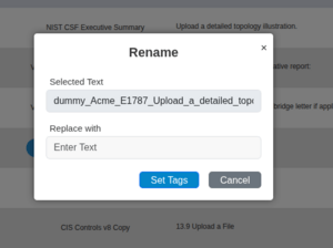 Clicking the link will display a prompt confirming that you wish to rename the file and a field to enter the new name. To rename the file, enter the new name and click Set Tags. To avoid renaming the file, click Cancel.