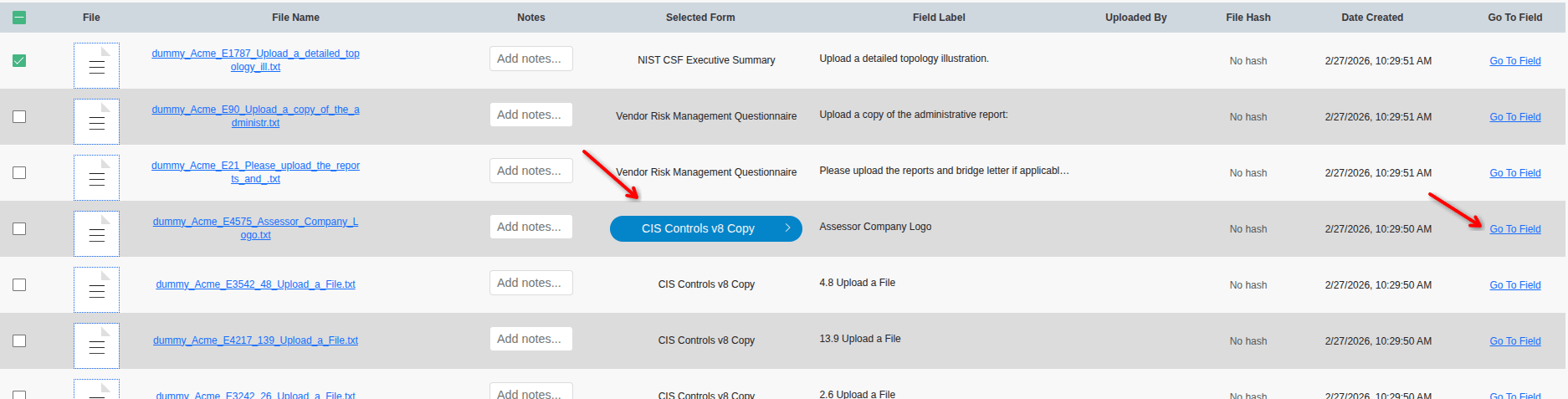 Each file instance is associated with a form field to which a user has uploaded some data. To jump immediately to that field, click on the Go To Field link on the far right of the table. If a file has more than one instance across several forms, you can click on the form name in the Selected Form button to pick a form field, and then click Go To Field.