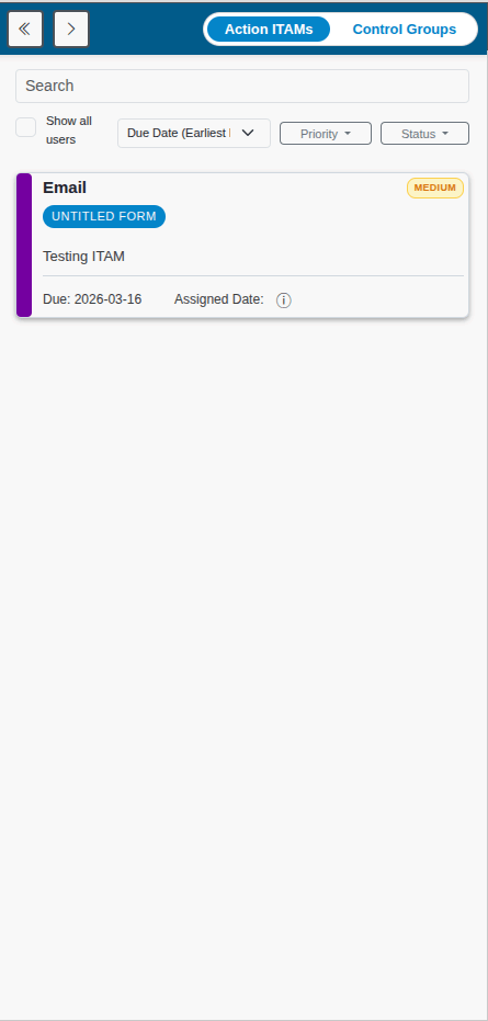 This panel will show all Action ITAMS assigned to you, including the name of the form associated with it, the title of the related field, the date it was transferred, and the date it is due. The Form Name field is also a link directly to the field in the form.